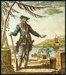 One of the most famous pirates was Edward Teach, 1680 (or so) – 1718. He was known as Blackbeard for his scraggly beard, which was, surprise, black. In a very short career, he developed a fearsome reputation. Little is known of his early life but sometime around 1716 he joined the crew of a West Indies pirate, Benjamin Hornigold, where he was given command of a sloop. Near the end of 1717, Hornigold retired (interesting story I’ll tell in the future) and Teach, with two ships continued his pirate ways, eventually capturing a 40 gun French Merchantman who he renamed The Queen Anne’s Revenge.